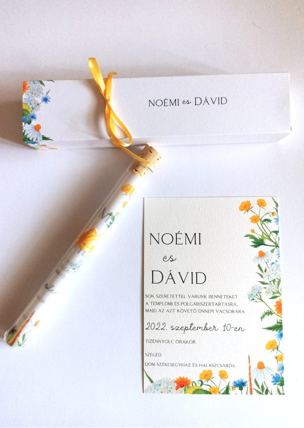 Réti virágos pausz esküvői meghívó kémcsőben, dobozzal